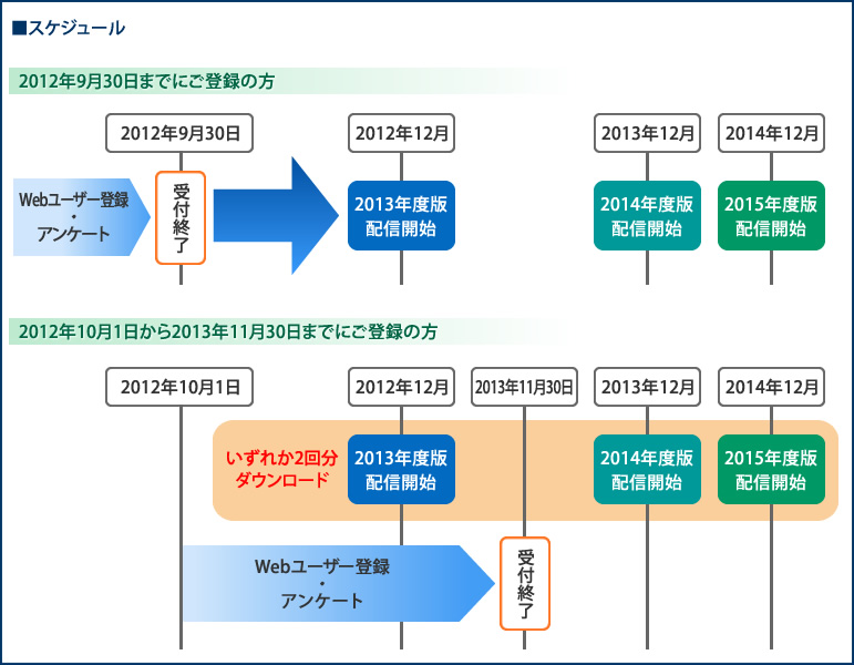 CN-LS810D、CN-LS710D、CN-S310WD、CN-S310Dを新規ご購入いただき、2016年11月30日までにWebよりユーザー登録(無料)及びアンケートを実施いただいた方対象に、更新地図ソフト(2014、2015、2016年度版)を最大3年分無償ダウンロード※できます。