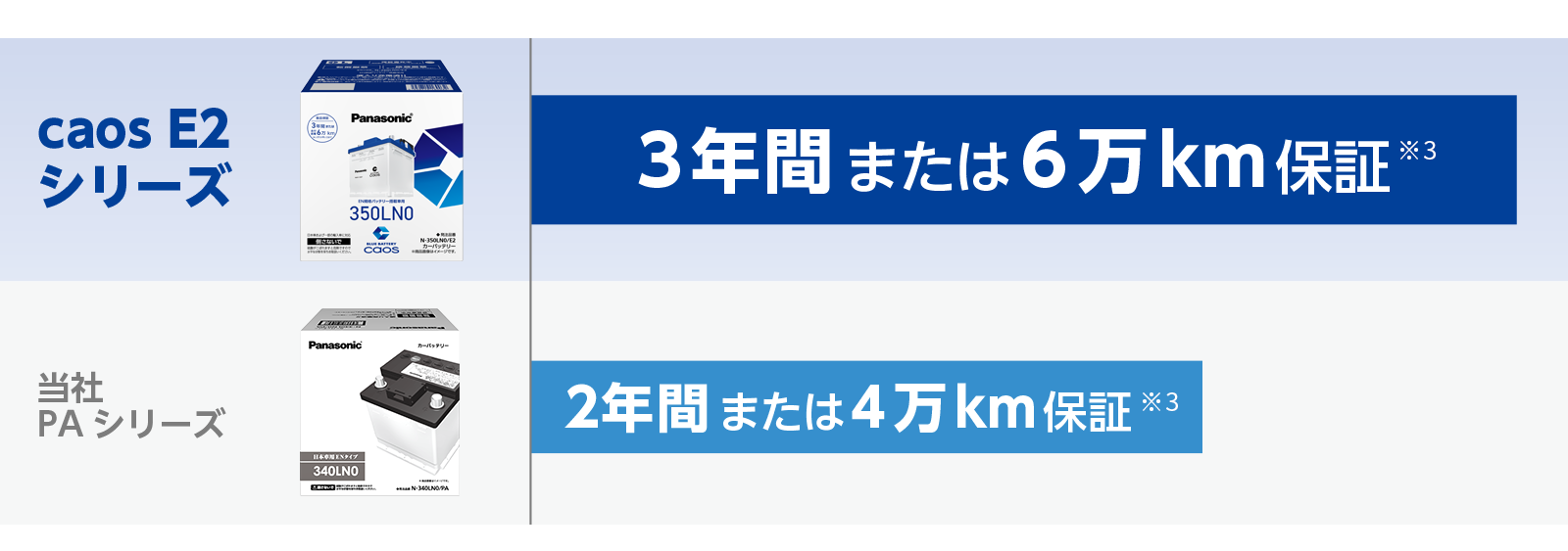 caos E2シリーズは3年間または6万km※2の業界最高水準の長期保証※3を実現。大容量と長寿命のcaosだからできる長期保証で、安心して使用できます。