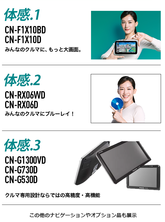 話題の大画面ナビゲーション"CN-F1X10C1D" をはじめ、各種カーナビゲーションやオプション品が展示され、