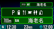 高速道路や有料道路に入るとインターチェンジやサービスエリア、パーキングエリアの名称や距離を表示。サービスエリアやパーキングエリアにある設備も確認することができます。