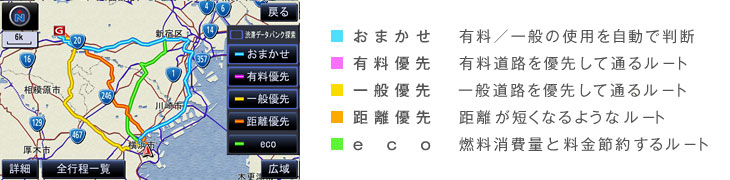 推奨ルートを自動判断する通常の「おまかせ」ルート探索に加え、「5ルート探索」では、「おまかせ」「有料優先」「一般優先」「距離優先」「eco」の5通りのルート探索結果を同時表示。その中から好みに合ったルートが選択可能です。