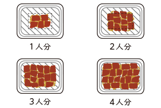 【焼く】 図のように、グリル皿へ平らに野菜を広げ、その上に肉を重ならないように並べて、上段に入れる。
