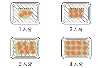 【焼く】 図のように、グリル皿へ平らに野菜を広げ、その上に皮目を上にし、さけを重ならないように寄せて並べる。残ったたれを上からかけ、上段に入れる。