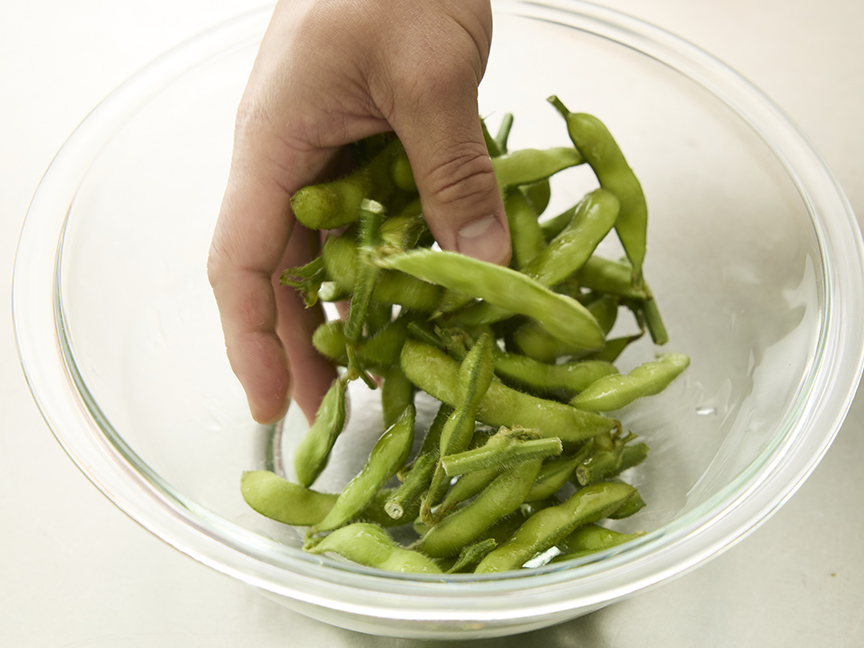 直径約25cmの耐熱ガラス製ボウルに枝豆を入れ、サラダ油を加えてよくもみ込む。