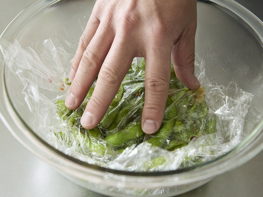 ラップを枝豆に沿わせてかけ、味がしみ込むまで冷ましておく。