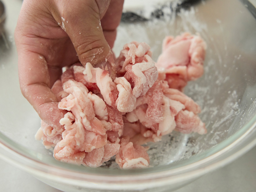 肉は3cm幅に切り、全体にかたくり粉をまぶす。