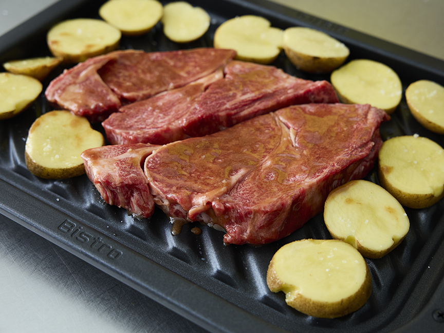 グリル皿の中央に2をのせ、肉を囲むようにして1を並べる。じゃがいもに塩をひとつまみずつふる。