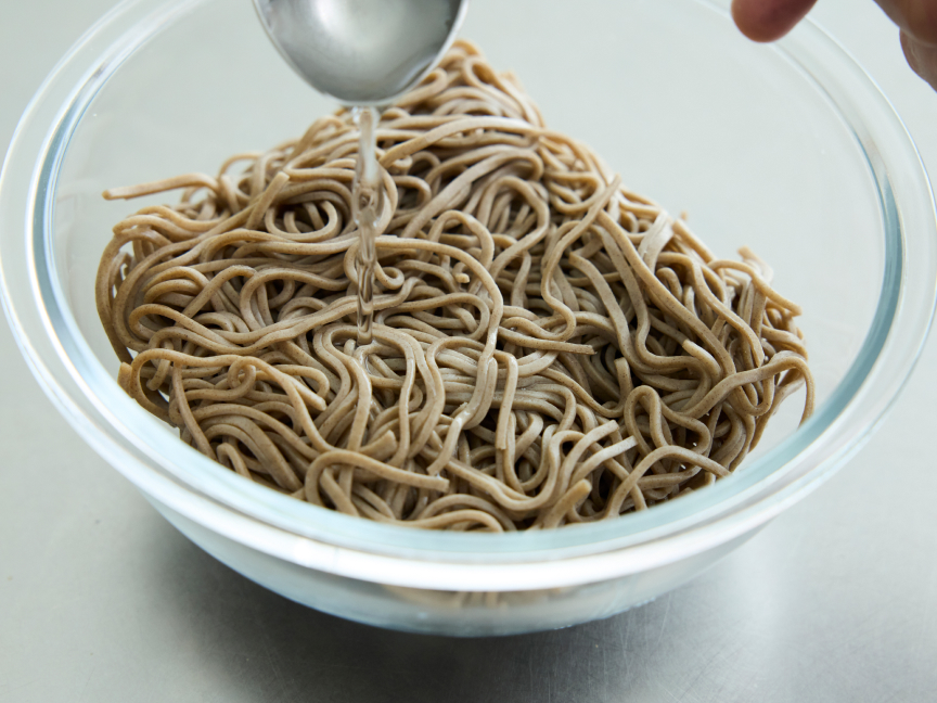 耐熱ボウルにゆでそばを入れて水大さじ1をふりかけ、ふんわりとラップをかけて電子レンジ(600W)で2分ほど加熱する。