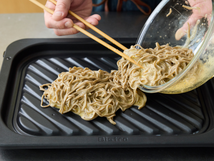 卵を割りほぐし、サラダ油、塩を加えてよく混ぜる。1の加熱が終わったらそばをほぐして卵液を加え、よく混ぜ合わせる。グリル皿に広げる。