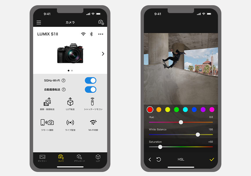 撮影した写真・動画をスマートフォンに簡単に転送できるアプリです。色調整やクロップなど思いのままに編集して、SNSに直接アップロードしたり、急ぎの仕事をワンストップで当日納品する際にも便利です。色味の編集情報をLUTとして保存し、カメラに転送して撮影に反映させることも可能です。画像・動画を高速転送できる5GHz帯をカメラ側で選択できます※。