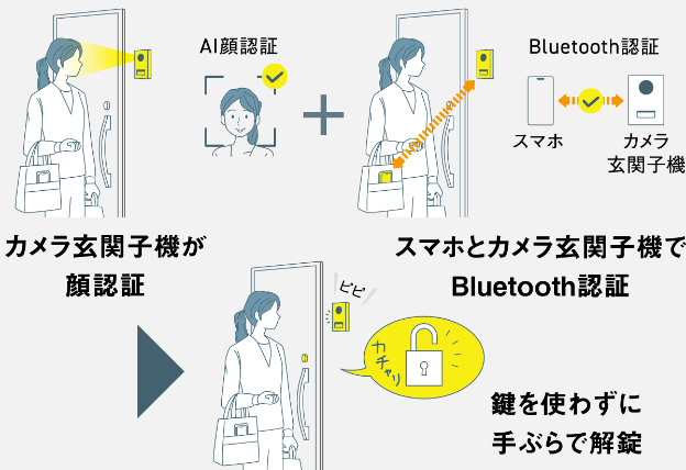 手ぶら解錠は、家族の帰宅時に、カメラ玄関子機での顔認証とスマホとのBluetooth認証をダブルで行うことで、手ぶらで電気錠を解錠できます。