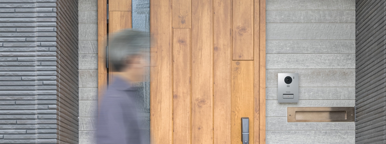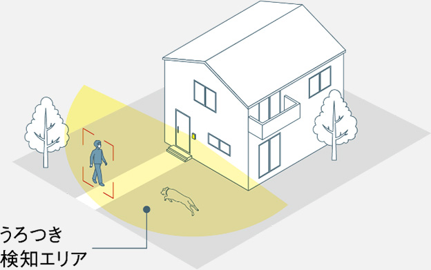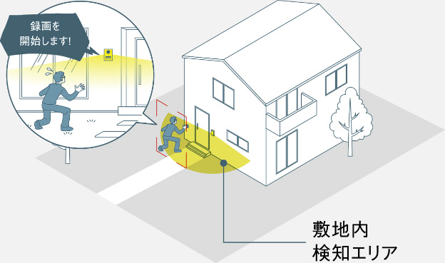 自宅前見守りとは、カメラ玄関子機のAI人検知が玄関前を警戒し、侵入者やうろつきを自動検知してくれる機能です。録画や通知と合わせて、光や音声での警告もできます。