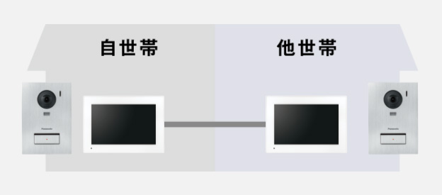 「独立二世帯住宅」にも対応。自世帯と他世帯のそれぞれに設置したドアホンシステムを有線で接続、連携させて使用することで、代理での応答や通話転送、内線呼び出し、セキュリティ連携などが可能です。