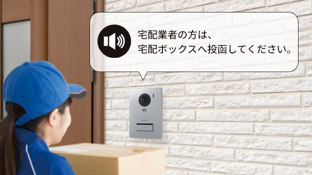 ドアホンが応答して宅配業者に宅配ボックスへの投函を案内。※5自動録画※6とモニター親機で荷受けをお知らせ。