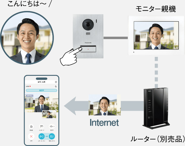 ※1:モニター親機をルーター経由でインターネットに接続できる環境および、スマートフォンへの専用アプリケーション「ドアホンコネクトS」のインストールが必要です。スマートフォンを連携させるには、インターネットに接続したルーター(別売品:グローバルIPアドレス[IPv4][IPv6を用いたIPv4]が付与されているインターネットとUPnPに対応したもの)にモニター親機を接続する必要があります。インターネット環境はグローバルIPアドレスが付与されるものをご用意いただき、UPnP機能、「2.4 GHz」の周波数帯域に対応したルーターをご使用ください(5 GHzの周波数帯では使用できません)。ご自宅で使用の場合でもインターネット環境が必要です。ご契約の回線がxDSLなどでインターネット上り回線速度が低いような場合は、宅外接続で画像などが正常に表示できない場合があります。スマートフォン1台あたりインターネット上り帯域で1Mbps以上(4台の場合は4Mbps以上)を推奨。1台のスマーフォンで「ドアホンコネクトS」アプリに登録できるモニター親機は2台までです。