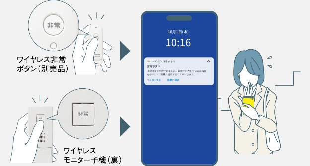 室内のモニターやワイヤレス非常ボタン( 別売品)の非常ボタンが押されると、モニター親機や登録のスマホに緊急通報します。通報を受けたスマホはモニター親機と通話が可能です。また、玄関子機からの発報も可能です。