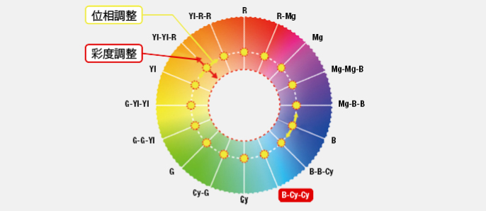 映像カラー(色相環)の16軸に対して、それぞれ色相調整や彩度調整を行うことで、個別に効果をもたらすことができる機能。同一の光源下での複数カメラの色合わせや、クリエイティブな映像演出が可能です。