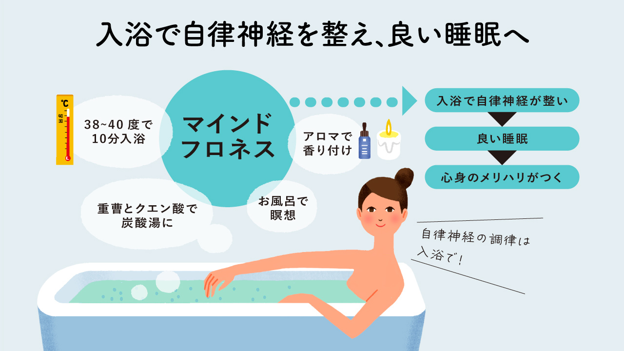 「最低限の睡眠時間の確保や、就寝前のスマートフォンの使用を控えるなど心がけてほしいこともありますが、手軽なのが入浴を利用する方法です。実は適切な条件のお風呂に入るだけで、交感神経から副交感神経への切り替えが行われ、自律神経のバランスを整えることができるんです」