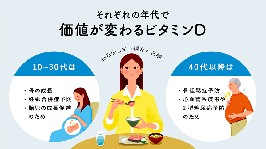 「ビタミンDはそれぞれの理由でどのライフステージの女性の健康にも利益がある栄養素だと思います。毎日少量でもビタミンDを摂り、体内で欠乏しない状況をつくることで、病気にかからない身体づくりにもつながっていきます。その効果は目に見えませんが、健康の下支えになっていることはまちがいありません。自分だけでなく次の世代にも恩恵がある栄養素なので、その効果を最大限、享受していただきたいです」