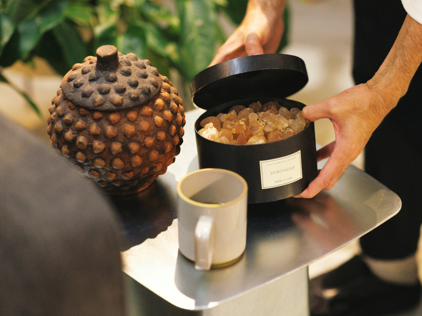 暖色系のダウンライトや観葉植物、香りの出る石などを添えて、リラックスできる空間にまとめました。