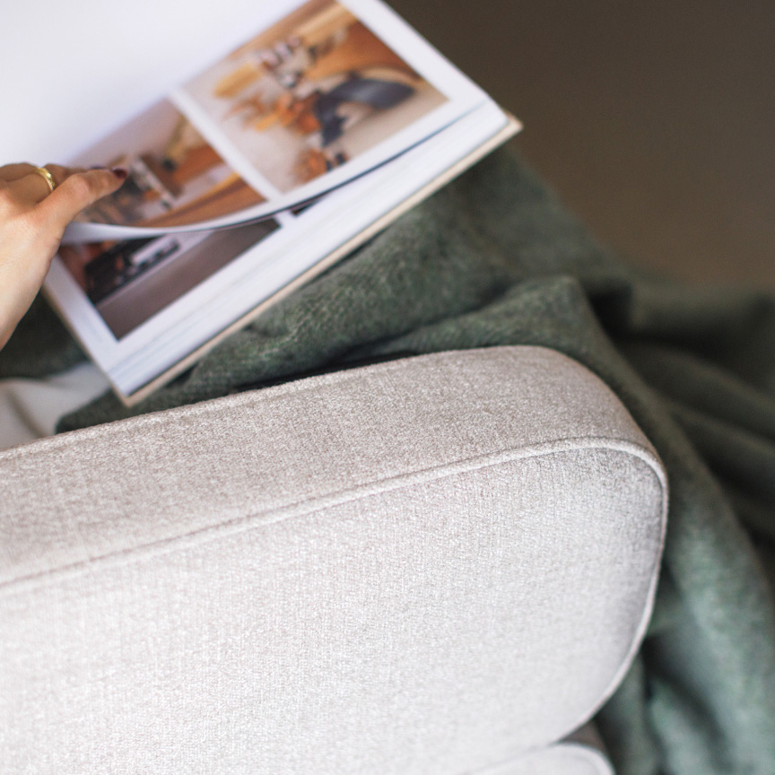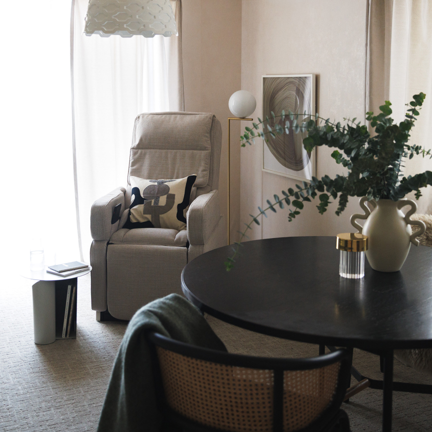 包み込まれるような座り心地だから、マッサージをしないときはラウンジチェアとして心地よく使えます。ここに座って子どもに本を読んであげたり、寝かしつけた後に一人でゆっくり過ごしたり。私にとって大切なふたつの時間を両立させてくれそうです。
