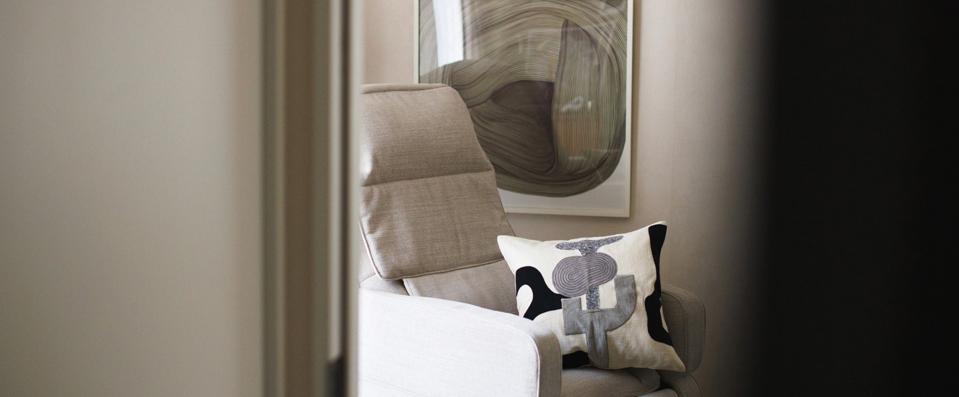 私の部屋は、壁紙・カーテン・絨毯などの色の濃淡で奥行き感を演出しています。一般的なマッサージチェアは部屋に置くと重厚感が出てしまうのですが、リアルプロ カーサラインはファブリックに繊細な濃淡があるため重い印象がなく、淡色の重なりを基調とした空間に自然となじんでくれました。
