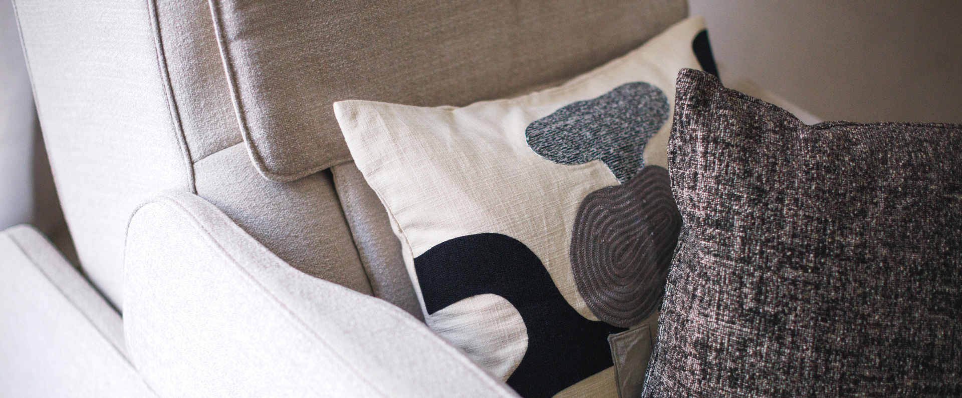どんな色ともあわせやすいデザインだから、季節や気分で小物を変えるのもいいですね。私は、少し柄のあるクッションを置いてみました。