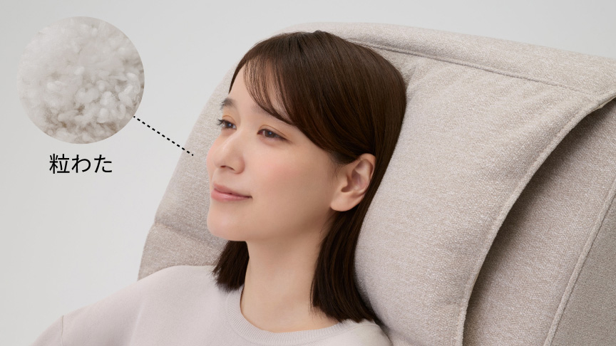 粒わたが体の形状に合わせて動くので、座ったときに柔らかく頭・腰を包み込みます。