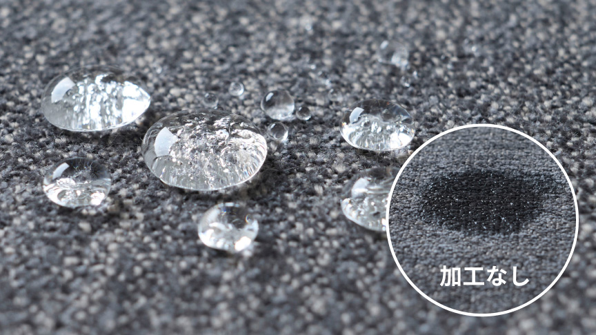 - 水分を多量に、または勢いよくこぼした場合、水分がしみこむ場合があります。はっ水加工は永久的なものではなく、ご使用により効果が低下します。試験方法はJIS L 1092(スプレー法)に基づく。