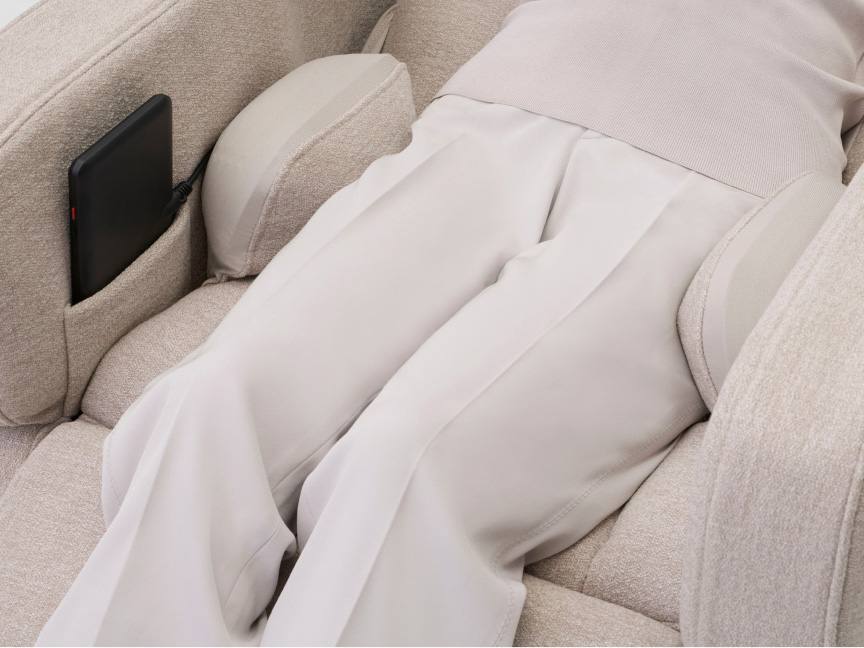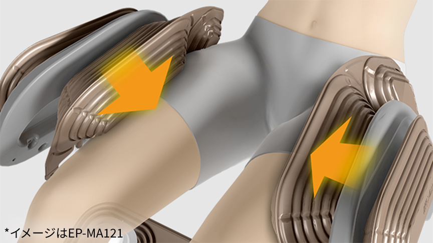 大きなエアーバッグが、太ももを横からはさみこんでしっかりマッサージ。太もも横側の筋肉にアプローチし、血行を促進することで、脚の疲れがスッキリします。