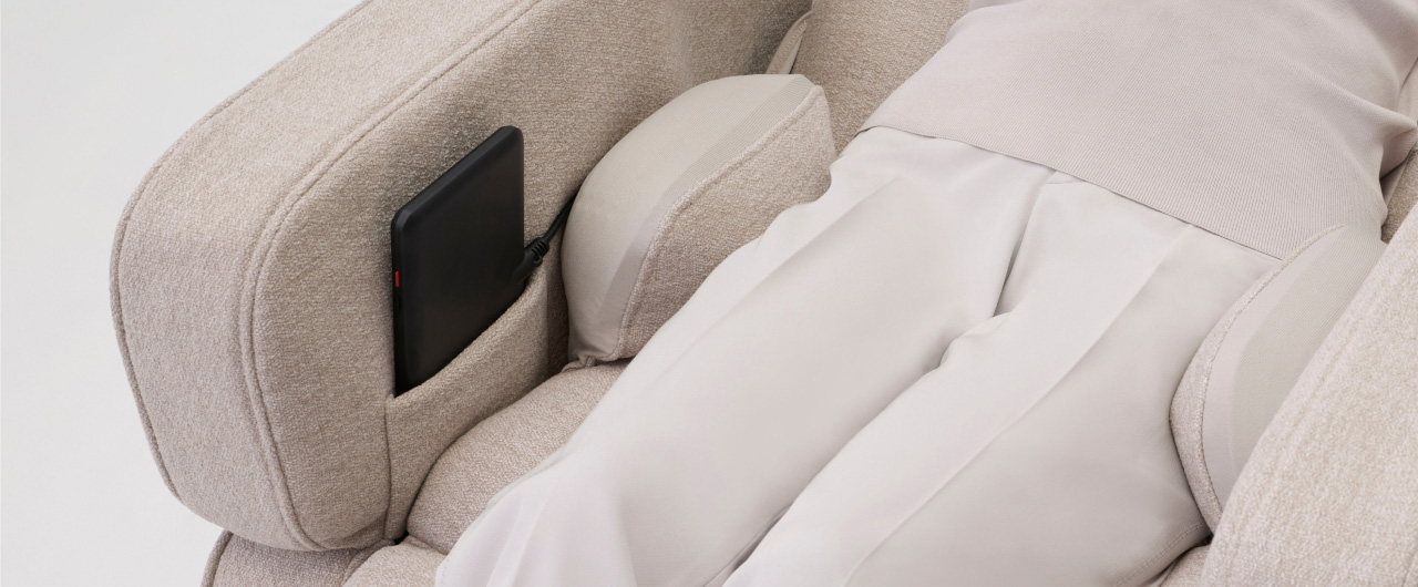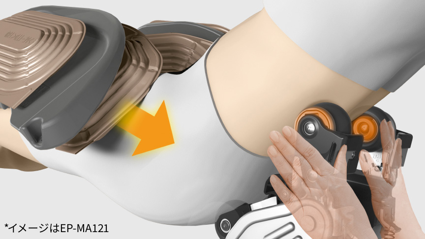 新フレーム採用により、太もものつけ根まわりまでモミ玉が届くようになりました。おしり全体をしっかりもみほぐします。