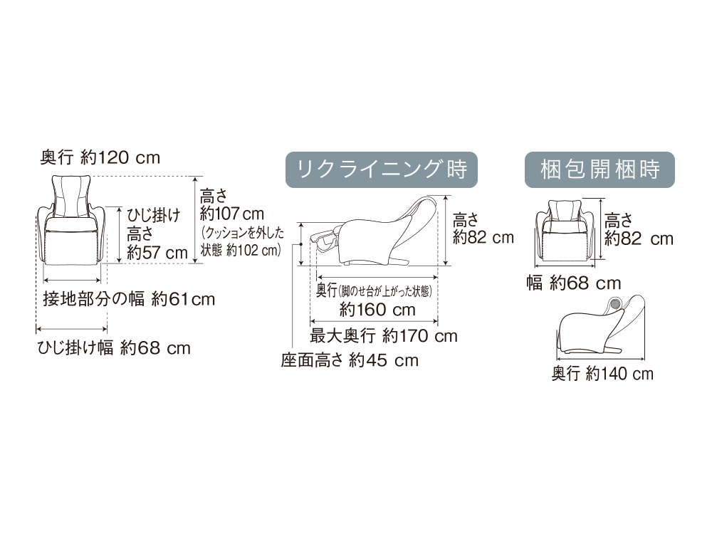 | 本体寸法 | リクライニングしていないとき:高さ約107×幅約68×奥行約120cm リクライニングしたとき:高さ約82×幅約68×奥行約170cm |