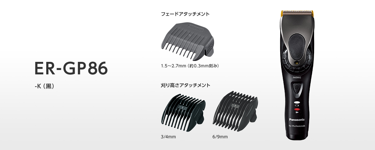 | 刈り高さ | ・直刃:約0.3mm※1 ・調節ダイヤル:約0.3~1.5mm(約0.3mm刻み) ・フェードアタッチメント:1.5~2.7mm(約0.3mm刻み) ・アタッチメント:3・4・6・9mm |