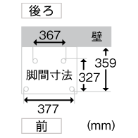 ![]() 前377 mm、後ろ(壁側)367 mm、縦327 mm、縦(壁から)359 mm |