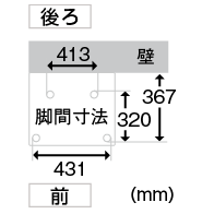 ![]() 前431 mm、後ろ(壁側)413 mm、縦320 mm、縦(壁から)367 mm |