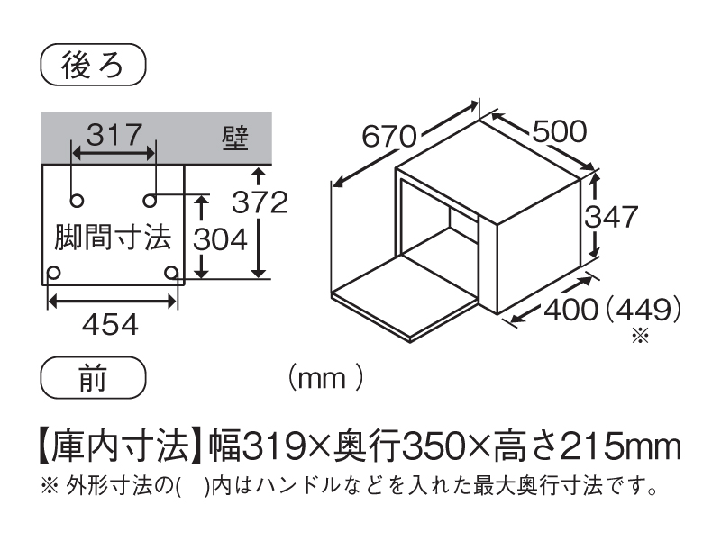 - ハンドルなどを入れた最大奥行寸法:449mm、ドア開放時の奥行寸法:670mm