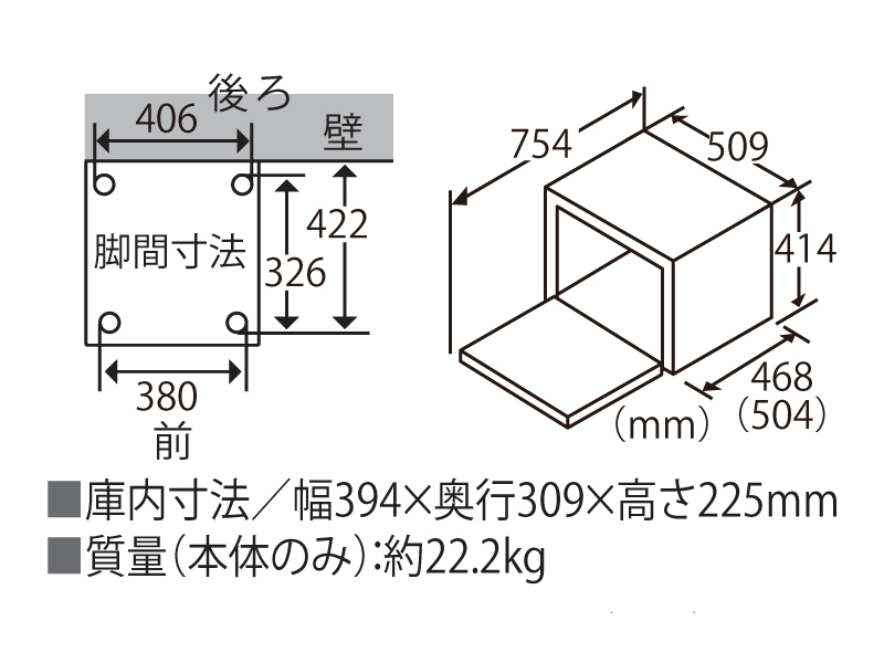 脚間寸法 前380mm、後ろ(壁側)406mm、縦326mm、縦(壁から)422mm