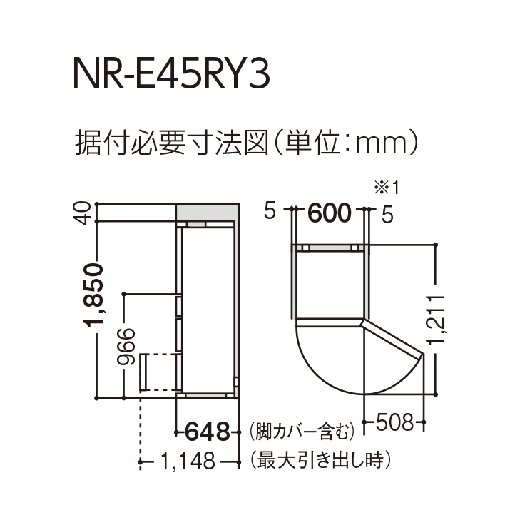 野菜室引き出し、最大引き出し時の奥行1,148mm