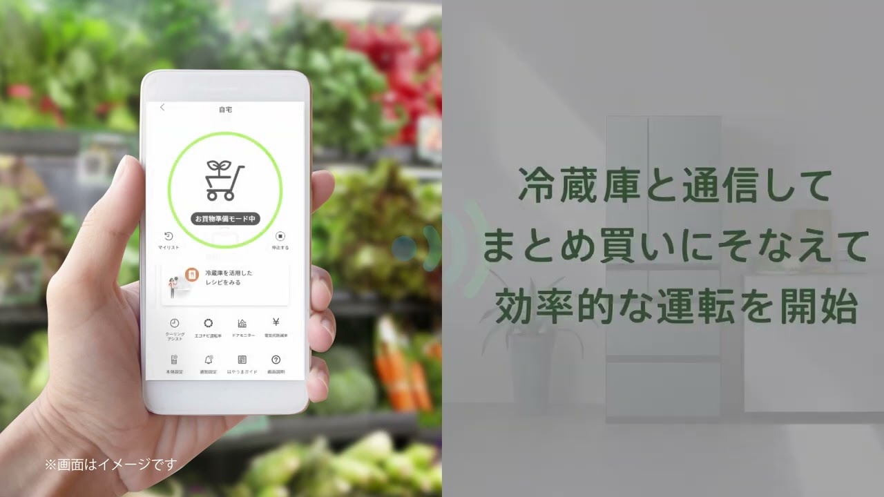 スマホのGPS機能による位置情報で買い物先にいることを検知し、「まとめ買い」を予測して庫内を冷却。