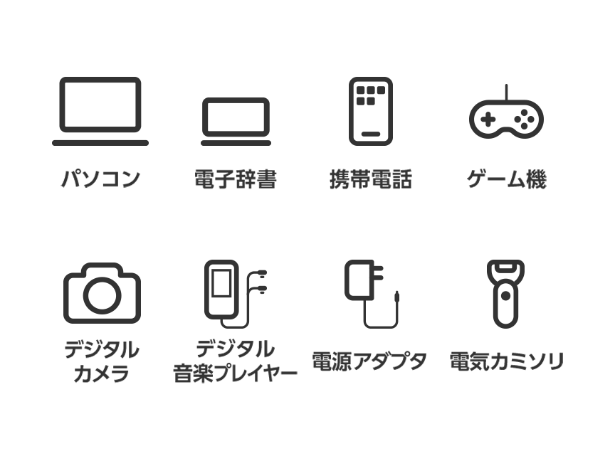 家庭用のエアコン、ブラウン管式テレビ、液晶式・有機EL式・プラズマ式テレビ、冷蔵庫・冷凍庫、洗濯機・衣類乾燥機