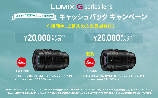 パナソニック株式会社は、LUMIX Gシリーズ 大口径F1.7ズームレンズシリーズ「H-X1025」「H-X2550」をご購入の上、ご応募いただいた方を対象とした「LUMIX Gシリーズレンズ キャッシュバックキャンペーン」を2021年8月26日(木)より実施します。
