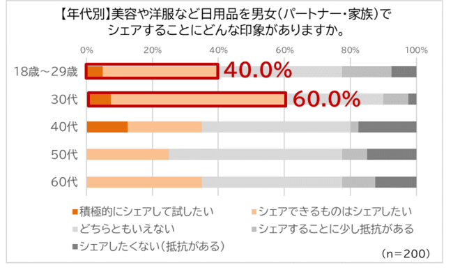 また、美容や洋服など日用品を男女(パートナー・家族)でシェアすることについて、全体で39.0%が「積極的にシェアして試したい」「シェアできるものはしたい」と回答しています。18歳~29歳は40.0%、さらに30代では60%と、30代以下の若年層ではシェア志向が強いことが判明しました。