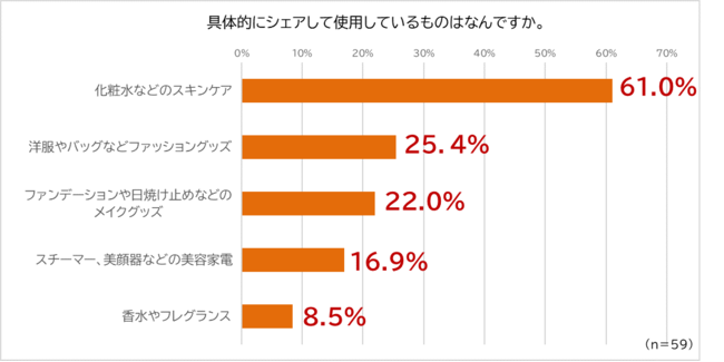 具体的にシェアしているものは「化粧水などのスキンケア」が61.0%でトップに。次いで「洋服やバッグなどファッショングッズ」「ファンデーションや日焼け止めなどのメイクグッズ」「スチーマー、美顔器などの美容家電」と美容関連のアイテムが上位となりました。
