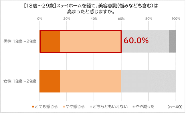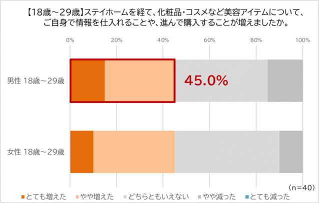 さらに、「ステイホームを経て、化粧品・コスメなど美容アイテムについて、ご自身で情報を仕入れることや、進んで購入することが増えましたか」という問いに対し、「とても増えた」「やや増えた」のは全体で22.5%に。ここでも18歳~29歳男性は45.0%と、同年代の女性と差異がなく、ひと際男性美容への関心の高さが判明しました。