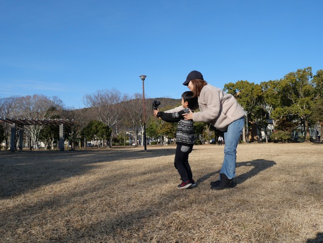手に取ってみて、まずコンパクトデジタルカメラとあまり変わらない軽量さ、コンパクトさにびっくり! そして、描写力や画質がスマホとは段違いにきれいで、よく行く公園などの見慣れた景色が違ったものに見えたことにも驚きました。子供たちと自撮りしてみても線が繊細で、輪郭がくっきりして見えるので、普段のスマホ写真に比べて「よく映っている」と感じました。普段の一コマがいい思い出として残ってくれそうですし、年賀状にも使えそうです。スマホで撮る方が手軽ですが、こんなにきれいに映るなら、一眼カメラで撮ってスマホ転送した方がいいな、と素直に思いました。また、モニターをぱっと触るだけでシャッターが切れること、トライポッドグリップにシャッターボタンがあるのもとっても便利!家族で出かけても段取りや荷物管理もあって自分がまともに映っている写真がない、というのは「親あるある」ですが、これならいい写真も同時にしっかり残せそうです。 また、動きが素早い男の子は、動いている時はあまりきれいに撮れずスマホで苦戦していたのですが、本商品だと手ぶれしにくくきれいに撮影できました。シャッタースピード優先で操作できるのも、一眼カメラならではのメリットですね。スマホに比べて、ボケなどもきれいに出ますし、これから控えている卒園式や入学式など色んなものを撮りたい気持ちにさせてくれるカメラです。
