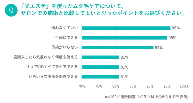 そこで、「光エステ」を使ったムダ毛ケアについて、「サロンでの施術と比較してよいと思ったポイント」を聞いたところ、「通わなくていい」(96%)、「手軽にできる」(95%)、「予約がいらない」(91%)がトップ3に。そのほか、「一度購入したら気兼ねなく何度も使える」(81%)、「1つでVIOすべてをケアできる」(81%)、「いろいろな箇所を処理できる」(81%)などの回答も目立っています。