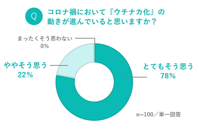 新型コロナウイルスの影響で、これまで外でやっていたことを家でおこなう『ウチナカ化』の動きが目立っている現在。今回の調査でも、「コロナ禍において『ウチナカ化』の動きが進んでいると思いますか?」と質問したところ、実に78%が「とてもそう思う」、22%が「ややそう思う」と答えました。