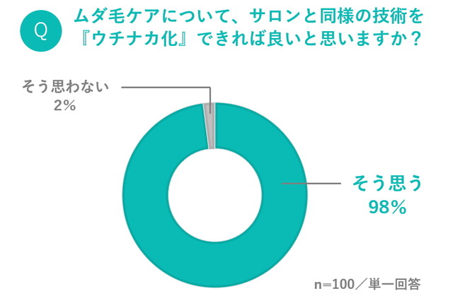 そして、暖かくなるこれからの季節に気になる「ムダ毛」のケアについても、『ウチナカ化』の意向を持つ女性が多いようで、「ムダ毛ケアについて、サロンと同様の技術を『ウチナカ化』できれば良いと思う」という人が98%に。また、ムダ毛ケアを『ウチナカ化』することで、「時間が節約できると思う」と答えた人、「コスト(費用)が節約できると思う」と答えた人もそれぞれ98%にのぼりました。