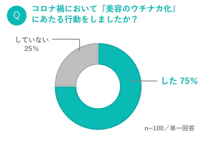 また、今回の調査では、美容分野においても『ウチナカ化』が進んでいることが判明。「コロナ禍において『美容のウチナカ化』にあたる行動をした」人は、実に7割超(75%)にのぼっています。なお、具体的にどのようなことをしたかを聞くと、「ヘアカラーや前髪カットは、美容院に行かずにセルフでおこなうようになった」(25歳)、「ネイルサロンに行かず、セルフネイルを楽しむようになった」(25歳)、「美顔器を購入してエステ通いを控えるようになった」(26歳)、などの声があがりました。今までは専門のサロンでおこなったり、プロに任せていたことを、自分自身で家の中でおこなう人が増えている様子がうかがえます。