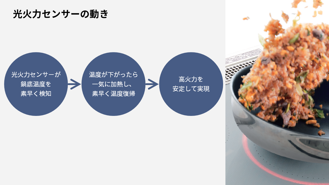 パナソニックIHは光火力センサーが搭載されており(※5)、鍋をコンロに戻すと瞬時に火力復帰するため、よりおいしく仕上げることができます。